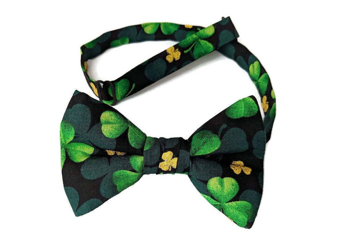Handmade Pre-tied Bow Tie - Black with Shades of Green Shamrocks Touched with Gold Metallic Clovers for St. Patrick's Day - Adult Men's Sizing - Crafted in the USA by Holiday Bow Ties, llc - The "Chance" Bow Tie