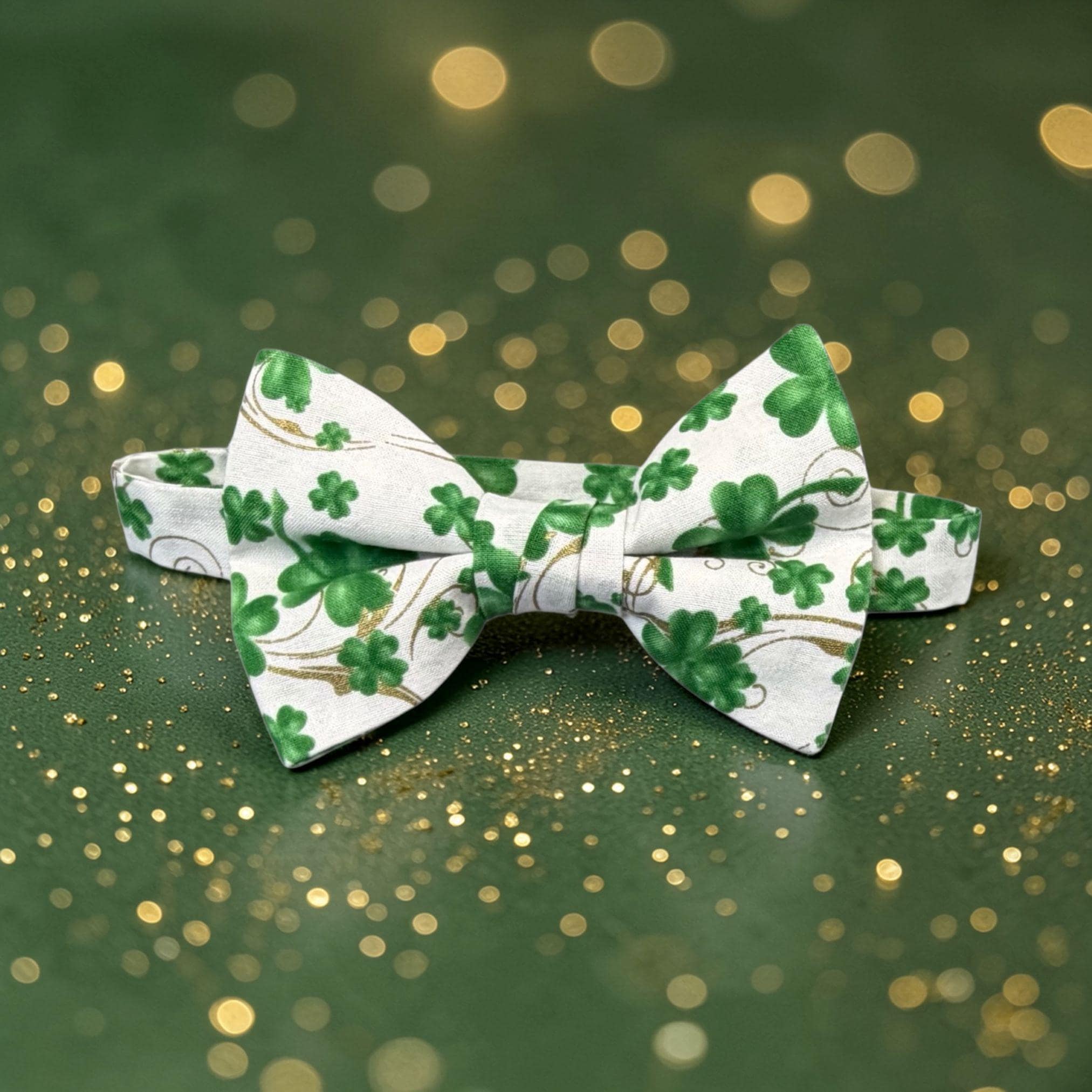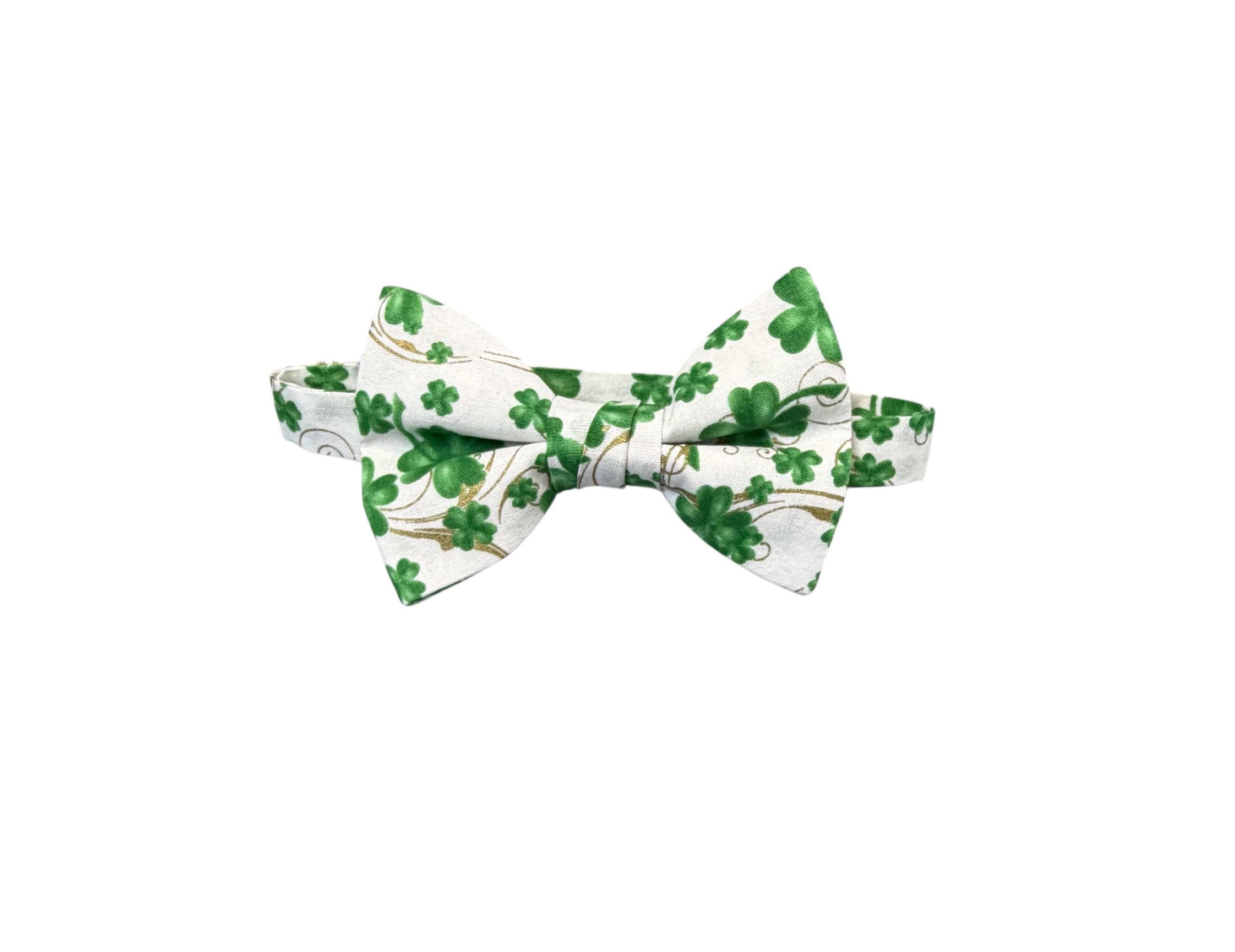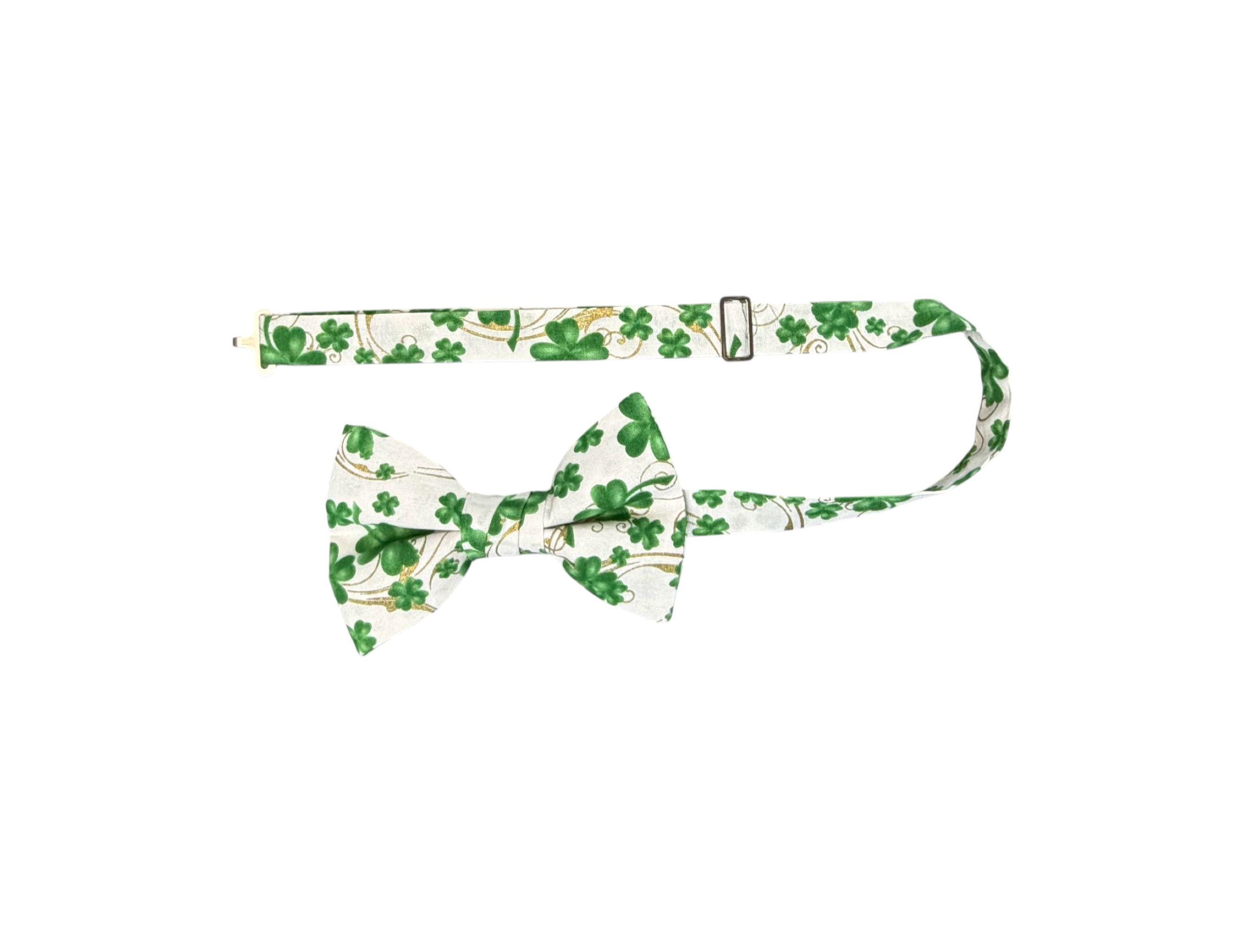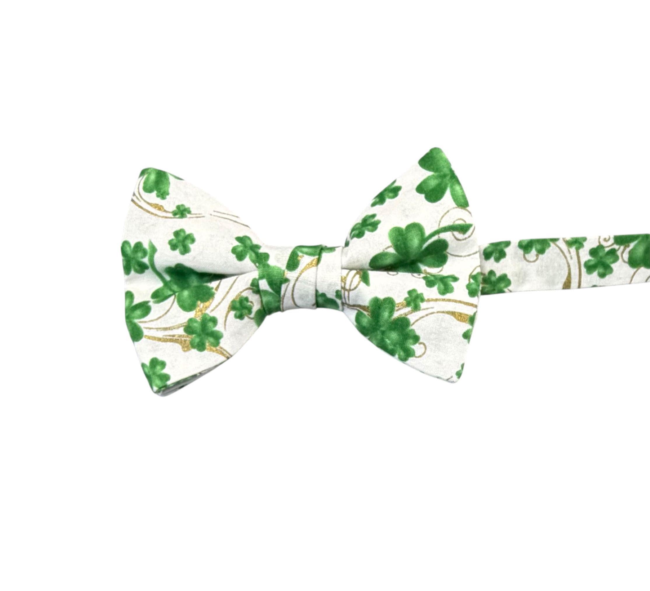 Saint Patrick's Day Bow Tie - Pretied and Adjustable - White with Shades of Green Shamrocks and Touched with Gold Metallic Swirls for Irish Celebrations - Adult Men's Sizing - Handcrafted in the USA by Holiday Bow Ties, LLC - The "Liam" Bow Tie