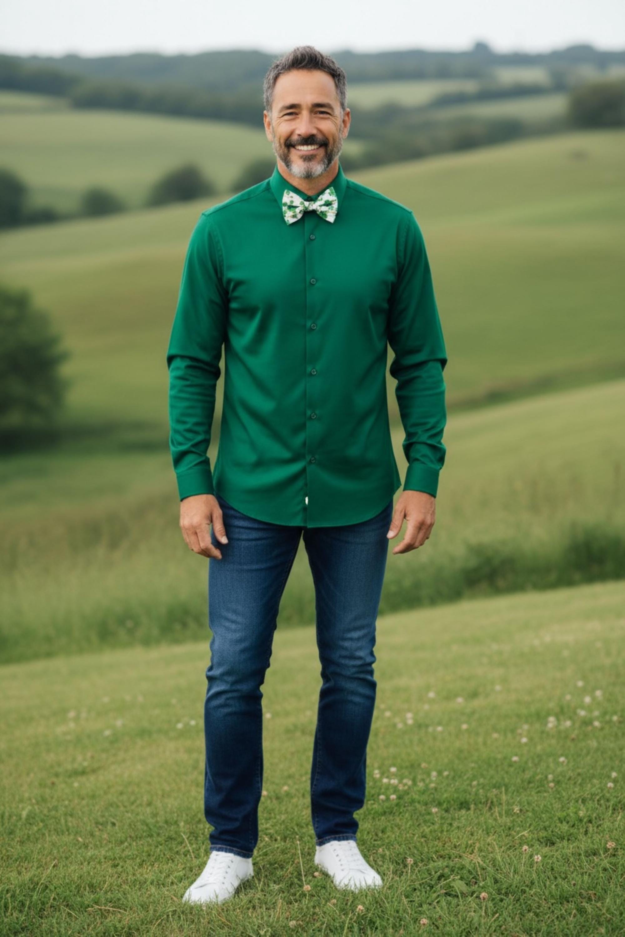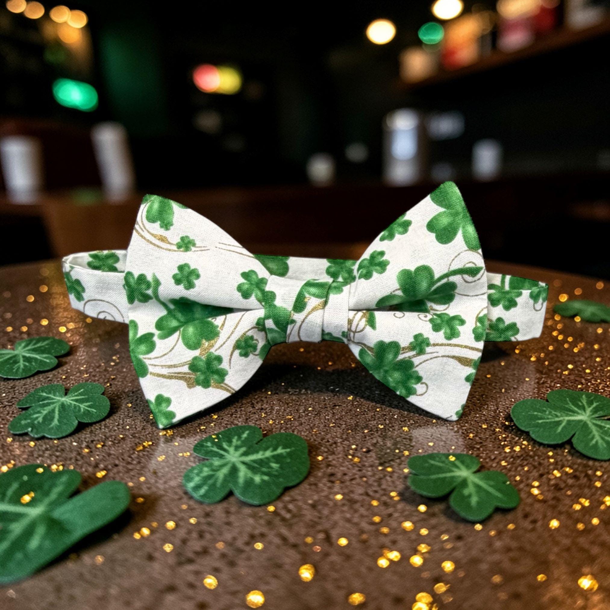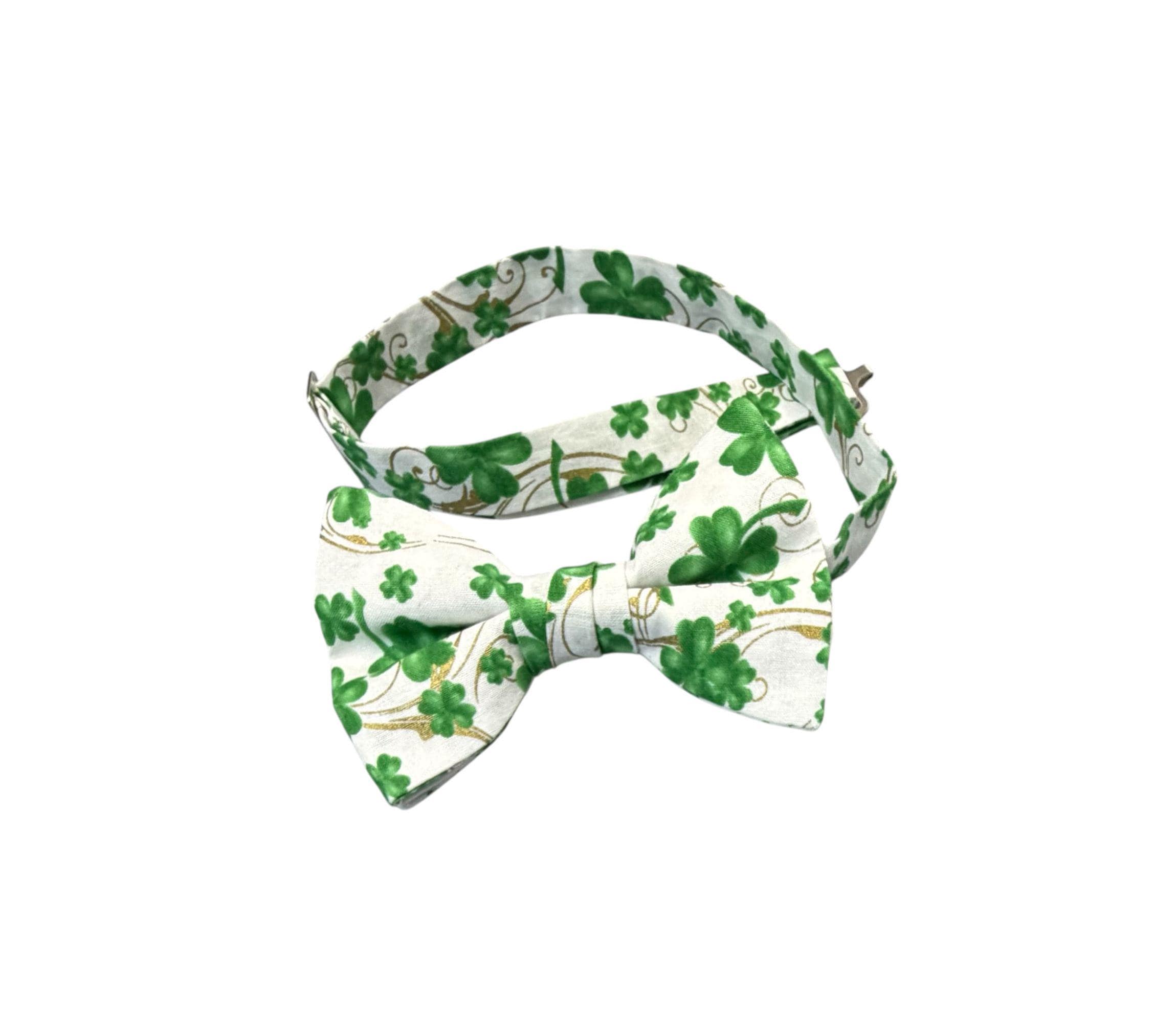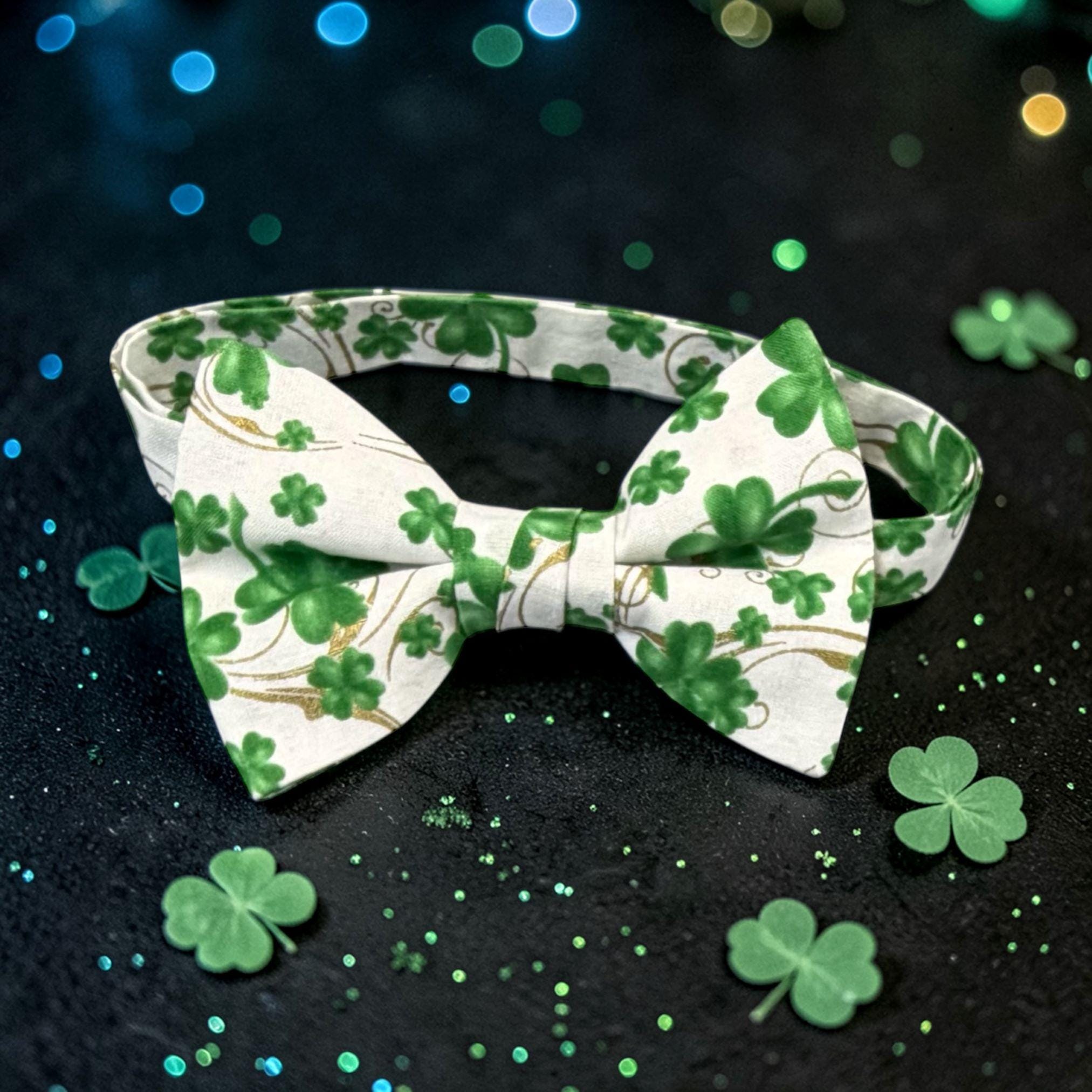 Saint Patrick's Day Bow Tie - Pretied and Adjustable - White with Shades of Green Shamrocks and Touched with Gold Metallic Swirls for Irish Celebrations - Adult Men's Sizing - Handcrafted in the USA by Holiday Bow Ties, LLC - The "Liam" Bow Tie