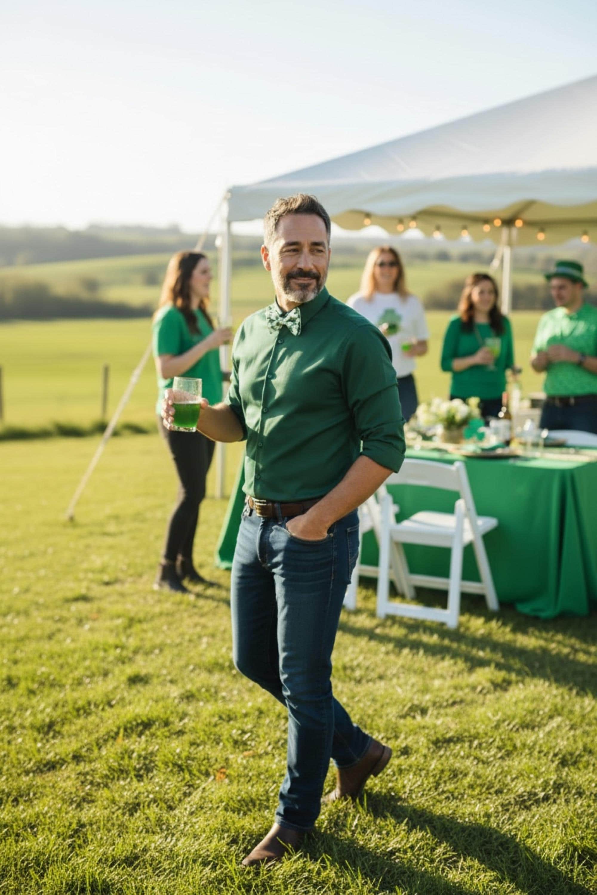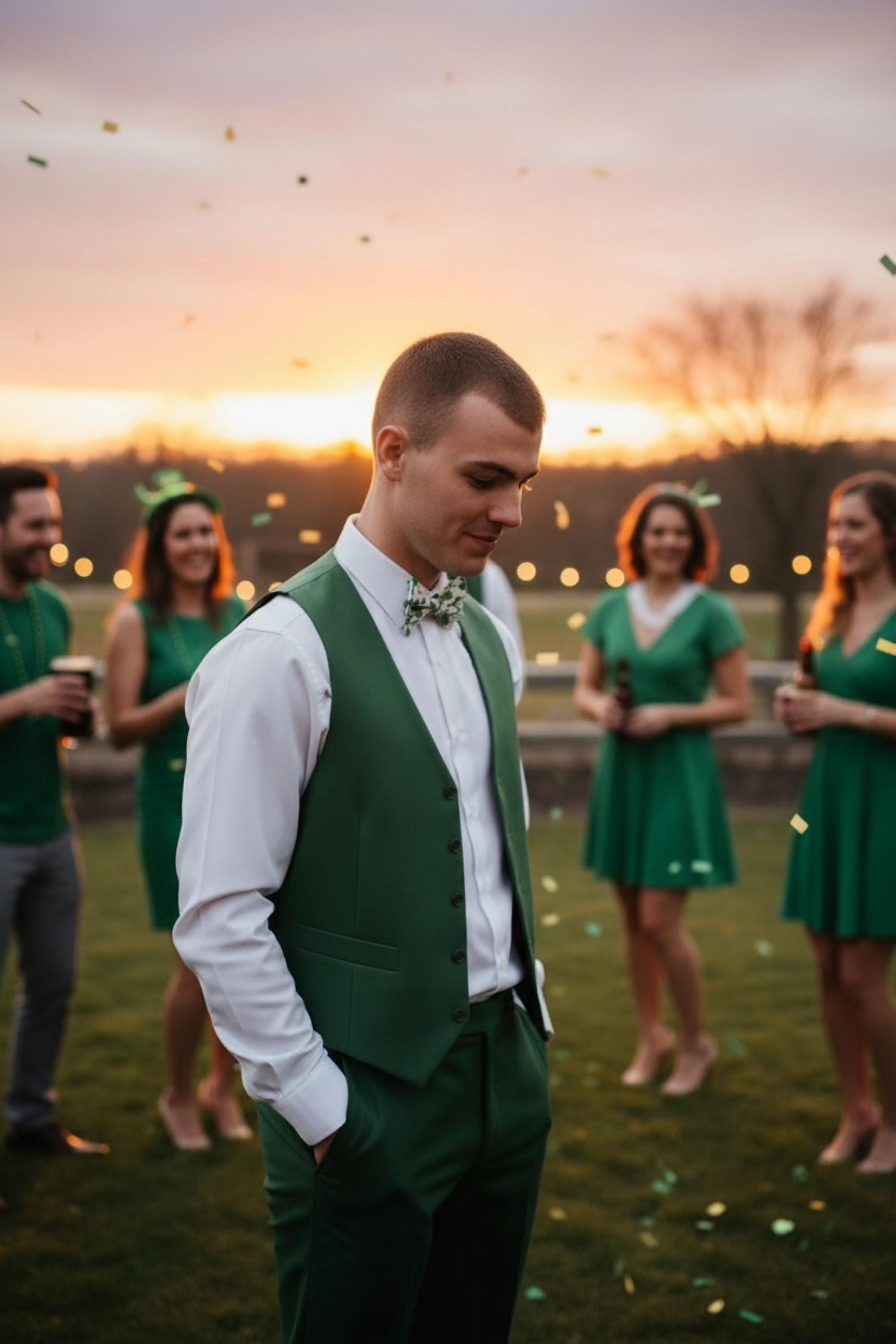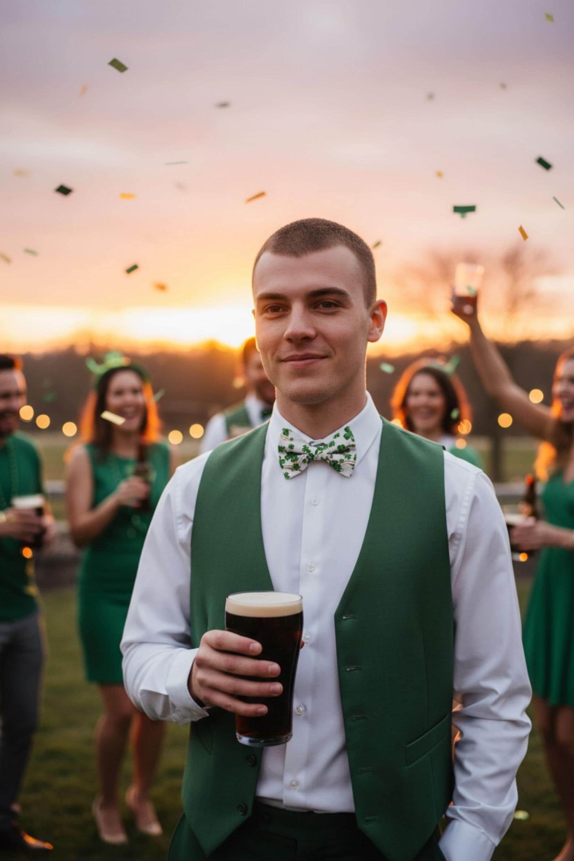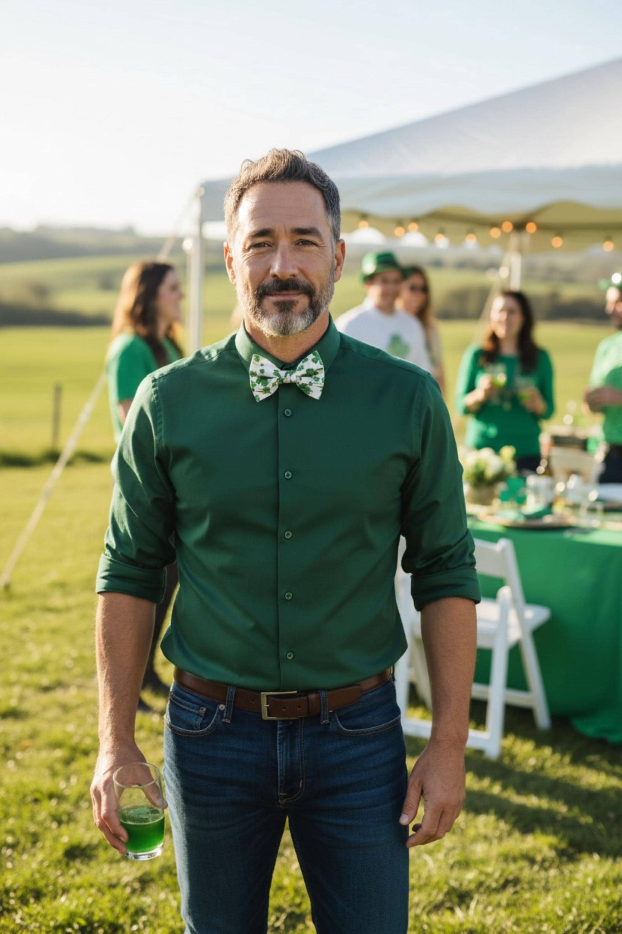 Saint Patrick's Day Bow Tie - Pretied and Adjustable - White with Shades of Green Shamrocks and Touched with Gold Metallic Swirls for Irish Celebrations - Adult Men's Sizing - Handcrafted in the USA by Holiday Bow Ties, LLC - The "Liam" Bow Tie