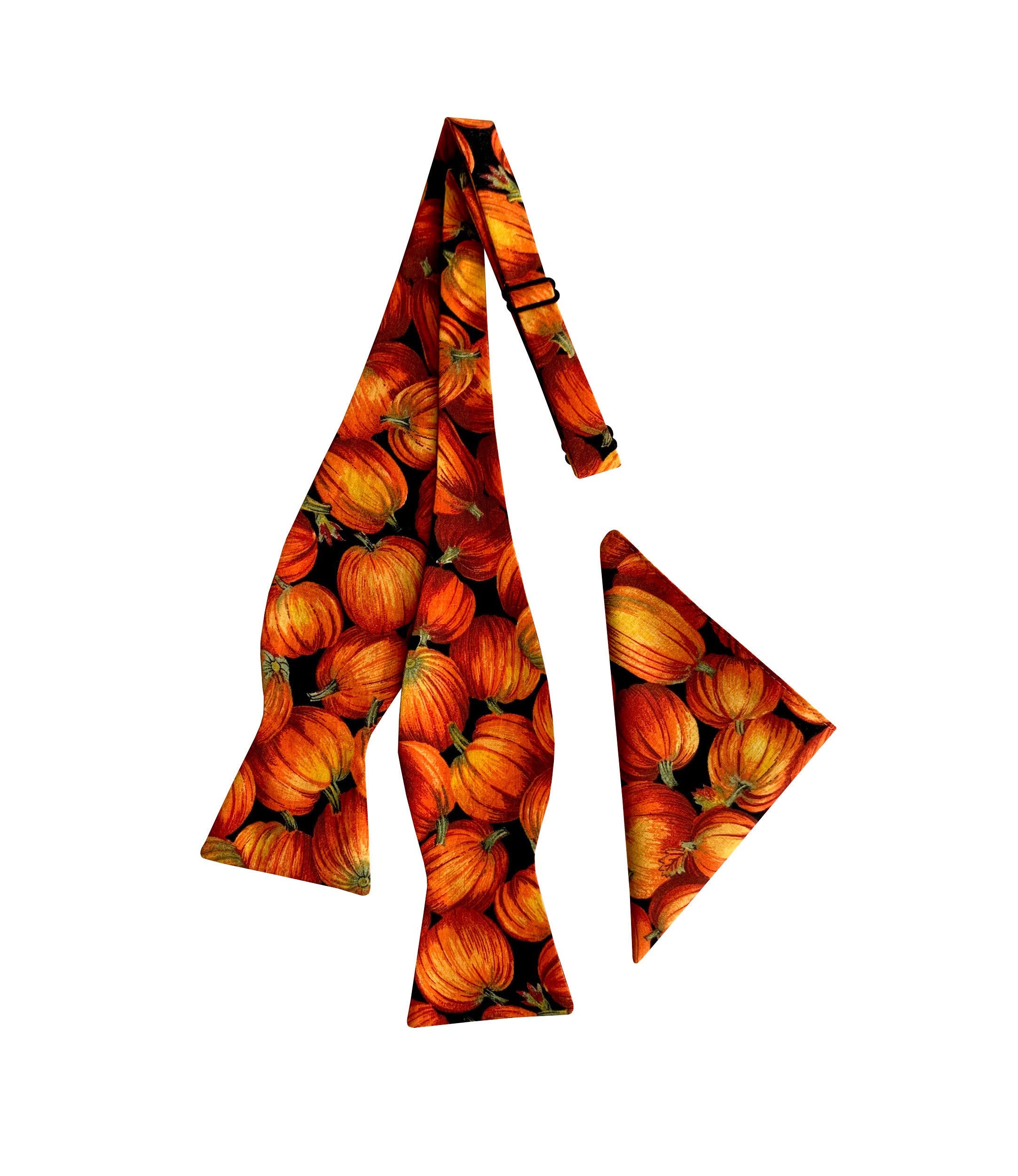 Handmade Self-tie Bow Tie and Pocket Handkerchief Set - Colorful Autumn Fall Pumpkins in Shades of Orange, Cranberry and Yellow - Premium Cotton Bow Tie - Adult Men's Sizing - Crafted in the USA by Holiday Bow Ties, LLC - The "Charlie" Bow Tie and Pocket Square Set